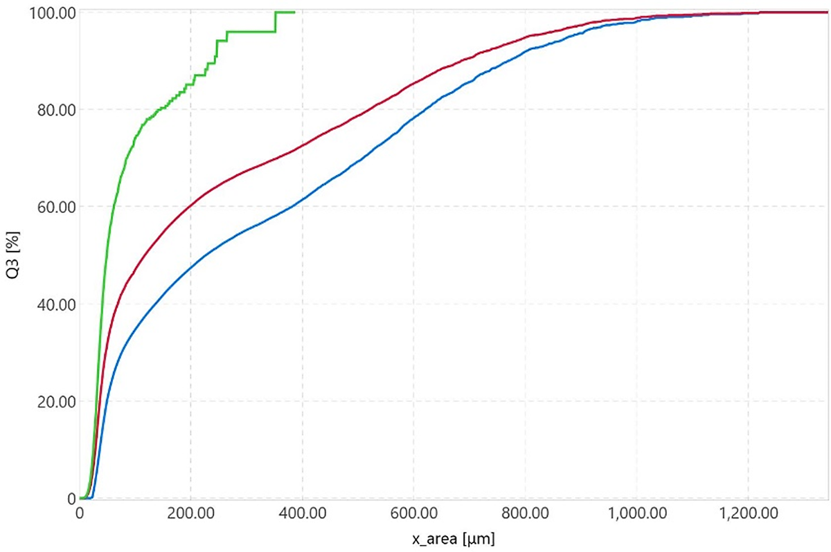 这在第二张图的示例中尤为明显:图像分析发现长达 2 mm 的颗粒,激光结果未显示任何颗粒 >1200 微米!