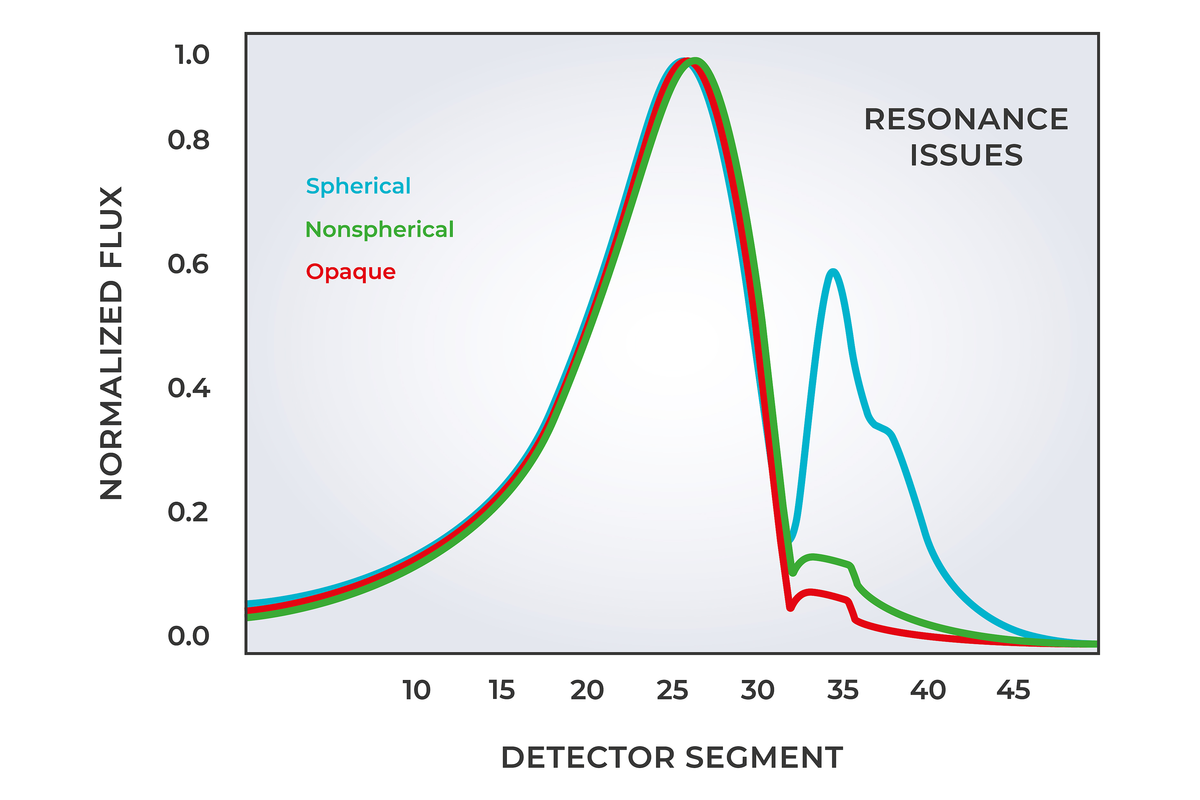 At the size considered in the diagram, note that a strong resonance feature exists for spherical particles. In comparison, the transparent non- spherical one having the same size shows extensive reduction of the resonance to the extent that it approaches a completely absorbing particle. In this case, the strict Mie theory (spherical) calculations should not be used which explains the use of Modified Mie Theory calculations in Microtrac instruments.