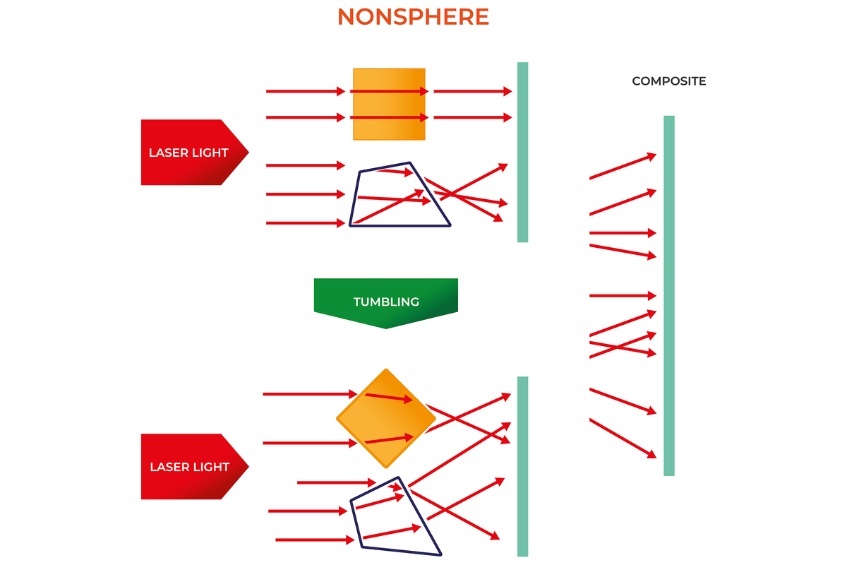 If the particles are not spherical but are transparent, the compensation (calculation) is not the same as for spherical particles. For NON-SPHERICAL shapes, orientation is constantly changing (Figure 2). The refracted components then produce a combined refraction pattern due to the many orientations presented to the incident light.