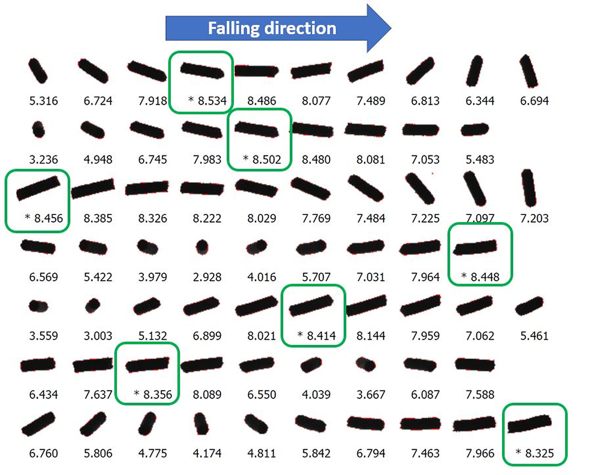 In many image analysis methods for particle measurement, each particle is recorded only once in random orientation. Especially for particles with a defined geometry, such as lenses or rods (e.g.: extrudates), it is very likely that the relevant projection is not captured during the acquisition: for example, rods tend to be measured "too short" with random orientation.