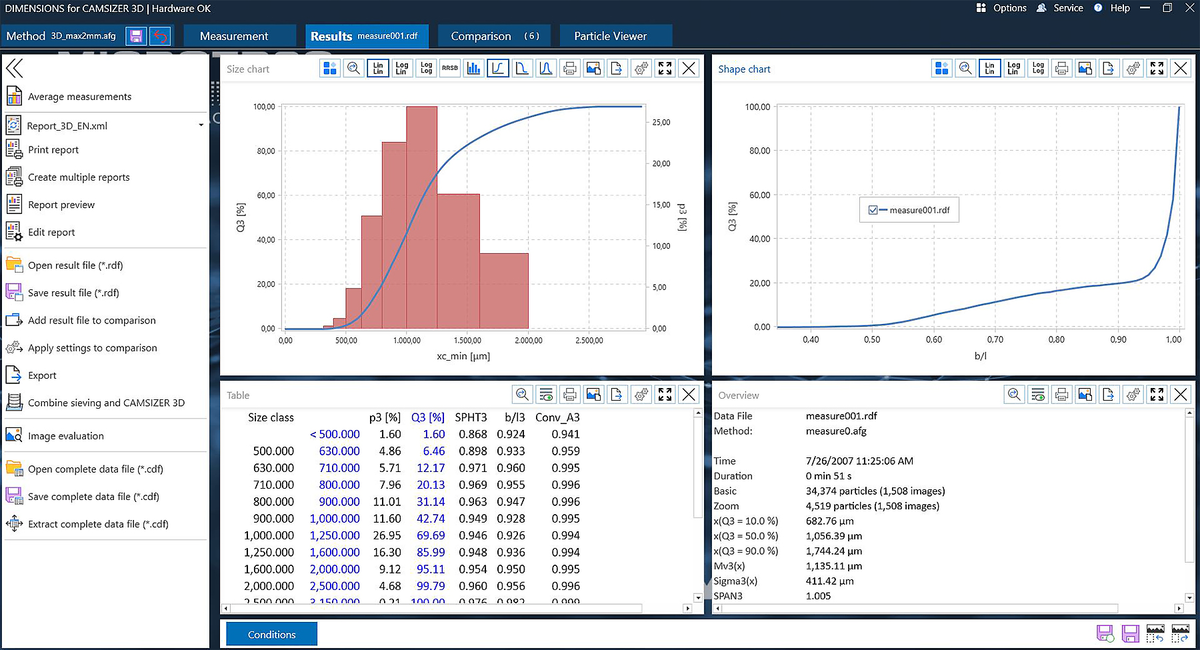 DIMENSIONS IA 展示了通过 CAMSIZER 仪器获取的粒度和形状分析结果。对每种颗粒,均记录有数十个形态参数。