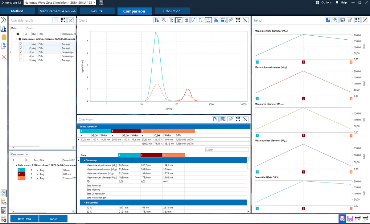 DIMENSIONS LS 展示了通过 NANOTRAC 分析仪获取的粒度分析结果。此外,还可比较不同数据库的结果。