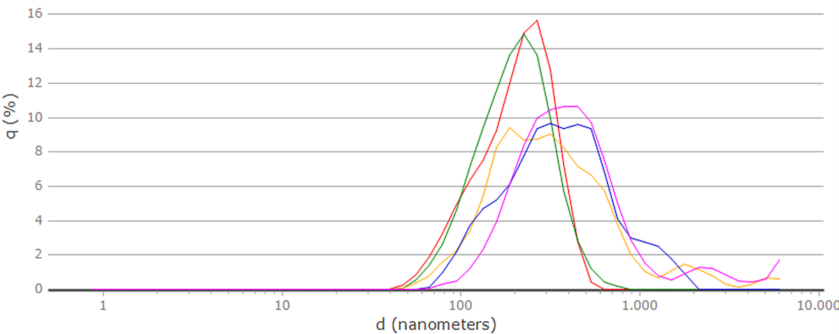当粒子带有强正或强负 zeta 电位时,粒子之间也存在强排斥静电相互作用。 这可以防止颗粒彼此靠近并形成附聚物。 根据 DLVO 理论,当粒子彼此靠近时,范德华力就会生效,这是基于偶极-偶极相互作用。 这些力量具有吸引力。 zeta 电位接近于零时,双电层的排斥作用小,更容易发生凝固。zeta 电位不是分散体稳定性的直接测量值,但它提供了对稳定性的良好预测。 由于 zeta 电位的分析比稳定性测量更容易和更快,因此 zeta 电位通常用于评估分散体的质量。 改变电解质组成和浓度会导致 zeta 电位的变化。 下图显示了五个示例样本的效果: (1) -20.6 mV (2) -16.8 mV (3) -9.9 mV (4) +13.9 mV (5) +15.1 mV